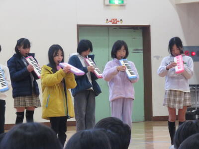 12月16日、児童朝会で図書委員会と保健委員会の発表がありました。