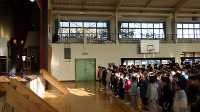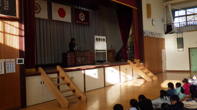2学期終業式を、体育館で行いました。校長先生から、学年ごとに2学期がんばったことのお話しがあったり、、冬休みの過ごし方についてクイズ形式で答えたりするなど、子供たちは最後までよい態度でしっかりと話を聞くことができていました。