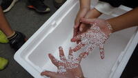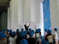 発泡スチロールの原材料となるビーズを実際に触り、発泡スチロールが機械からできあがって出てくる工場内を見学しました。
