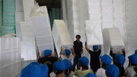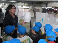 発泡スチロールを保管している倉庫では、人の手で何メートルも高く積み上げる様子の実演を見て、実際に発泡スチロールを持ち上げて軽さの体験させていただきました。