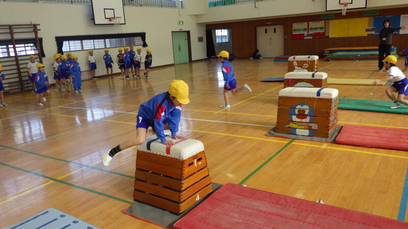 また、一人一人が自分の力に合った段数や跳び方を選び、めあてをもって練習する姿が見られます。中には台上前転に進んで挑戦する児童もおり、意欲的に運動に取り組んでいます。
