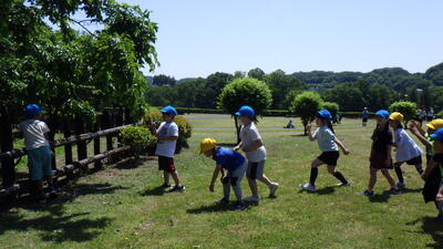 生活科見学では、徒歩で鉢形城公園に行きました。1年生と2年生が一緒のグループとなり、仲良く、元気に、楽しく行くことができました。鉢形城公園では、「鬼ごっこ」や「だるまさんがころんだ」などの遊びを楽しんでいました。